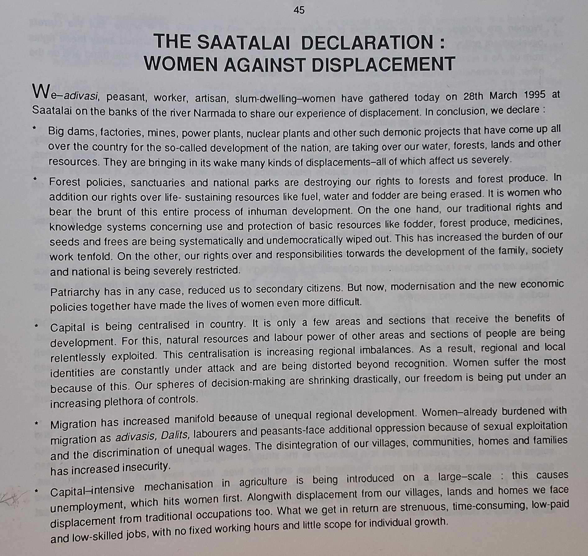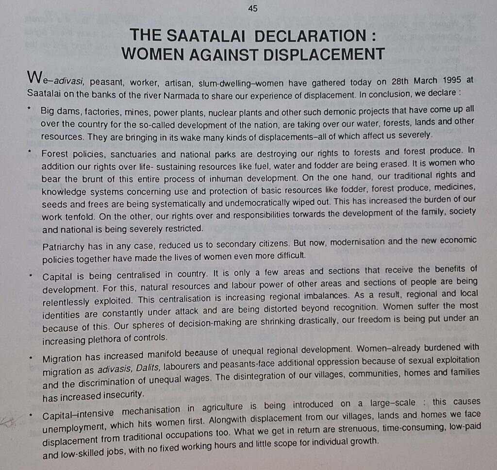 The Sattalai Declaration Women Against Displacement – We – Adivasi, peasant, worker, artisan, slum-dwelling women, have gathered today on 28 March 1995 at Sattalai on the banks of the river Narmada to share our experience of displacement. In conclusion, we declare,