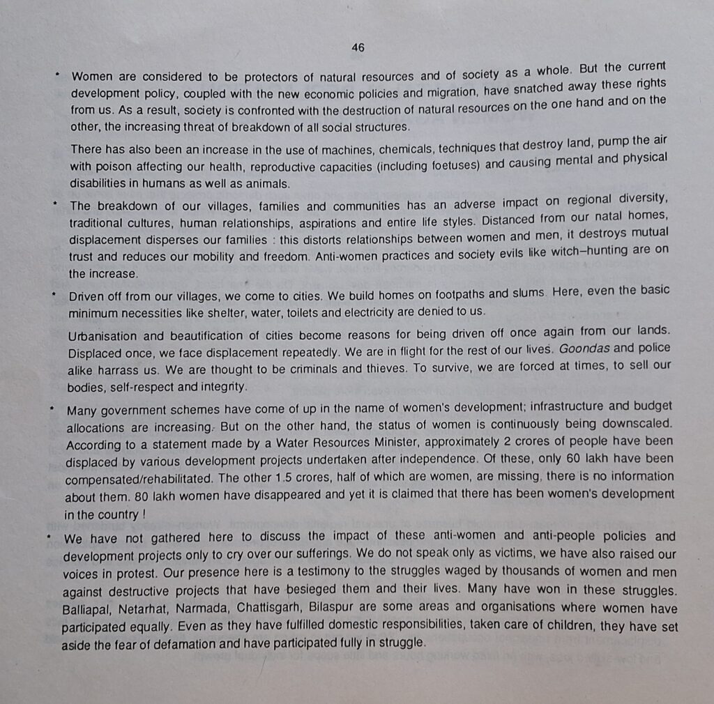 6. Women are considered to be protectors of natural resources and of society as a whole. But the current development policy, coupled with the new economic policies and migration, have snatched away these rights from us. As a result, society is confronted with the destruction of natural resources on the one hand, and on the other, the increasing threat of breakdown of all social structures. There has also been an increase in the use of machines, chemicals, techniques that destroy land, pump the air with poison, affecting our health, reproductive capacities, including foetuses, and causing mental and physical disabilities in humans as well as animals.