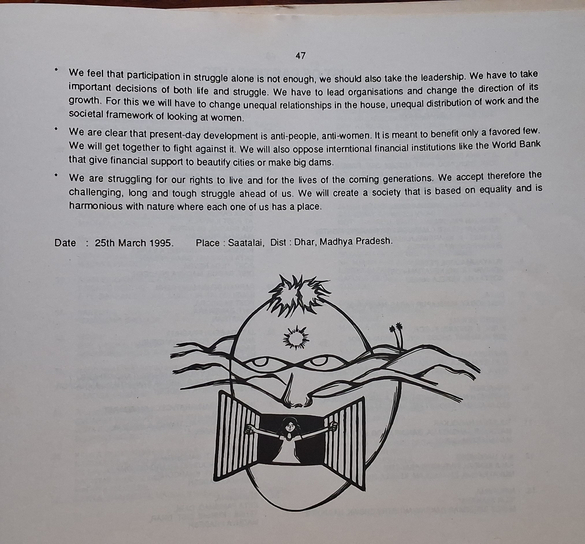 I had long wished to write about this historic preparatory meeting and the Sattalai declaration, as it marked a landmark in the global women’s and people’s movement, particularly around development induced forced evictions. However, I lacked the Sattalai Declaration text and the full list of participating organizations. All I had was the photo to the left, which seemed insufficient to convey the significance of the event. Besides, although women played phenomenal roles within the NBA, including leadership roles, no woman representative from NBA attended the Beijing Conference itself. Therefore, what happened at the world conference was not known to us as these were pre freely available internet times. But NBA ensured the preparatory meeting was well organized, and the declaration of demands was duly sent to the global platform.