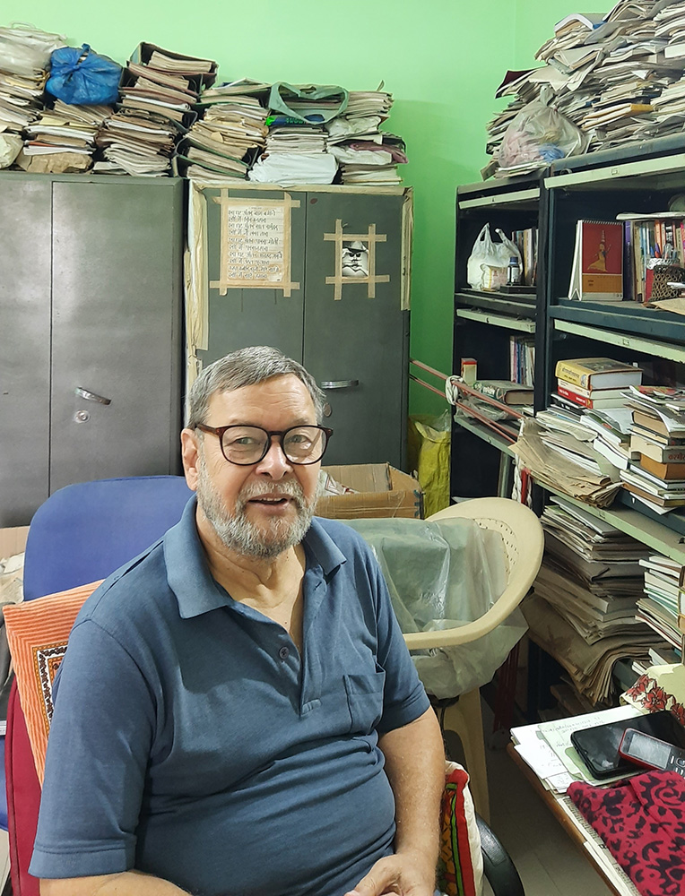 राकेश दीवान अपने घर और कार्यालय में, भोपाल, मध्य प्रदेश में।फोटो क्रेडिट: नंदिनी ओझा
