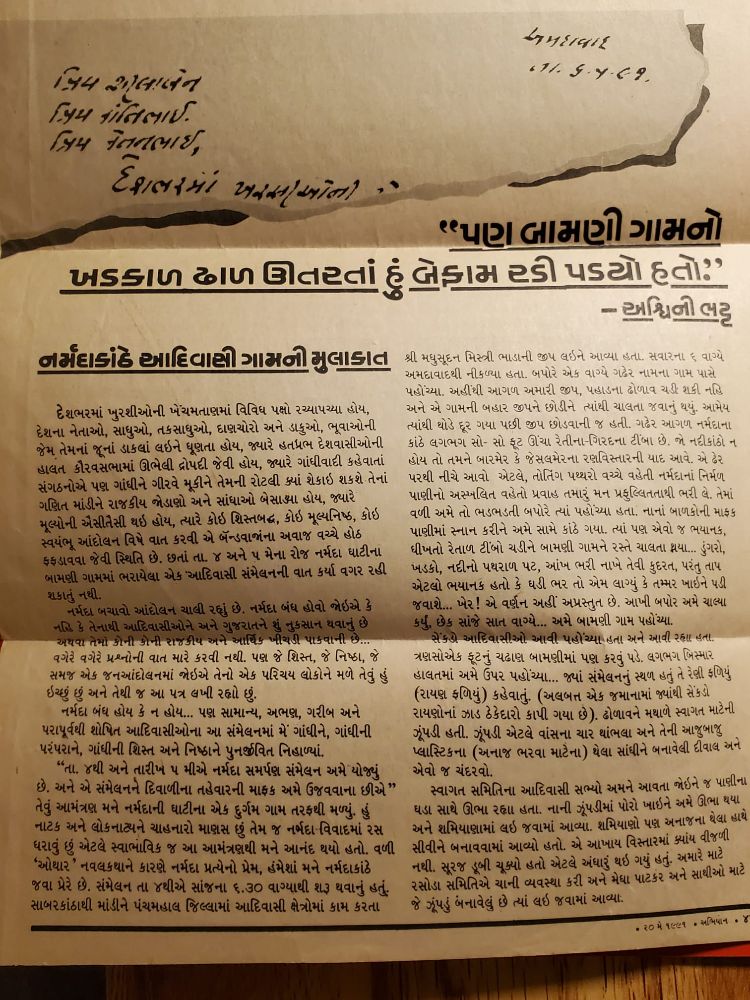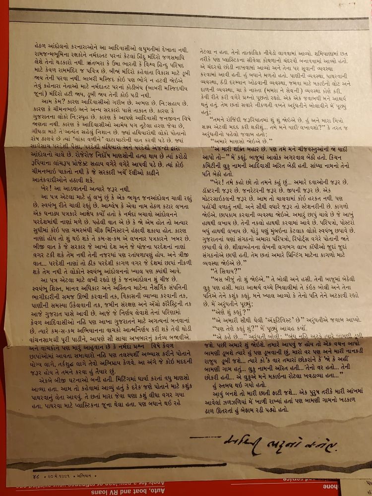 This profound letter in Gujarati, images of which are reproduced here, was written by one of Gujarat’s most popular novelists, columnists, and writers, the late Ashwinee Bhatt, on the issue of the displacement of Adivasis caused by the Sardar Sarovar Project (SSP), a large dam on the river Narmada. The letter was published in the widely read Gujarati magazine of the time, Abhiyan in 1991.