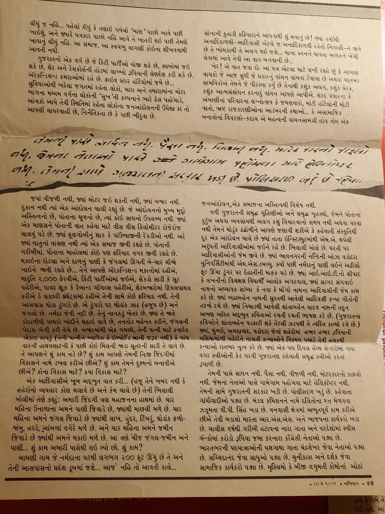 I write this so that we may understand what a people’s movement truly is: an opportunity to build spontaneous discipline, to assert human rights, to understand equitable sharing of natural resources, to redefine development, to address water issues, to protect land, and to explore agro-forestry. The decisions taken today will affect not just Adivasis but the whole of Gujarat. At the very least, we must provide readers of Abhiyan Magazine with material that enables informed, rational reflection. Let us adhere to responsible journalism. I urge readers: do not rely only on newspaper reports—study deeply, think critically, and form your own considered opinion on the issue of the Narmada (dam). I am ready to help in any way needed.